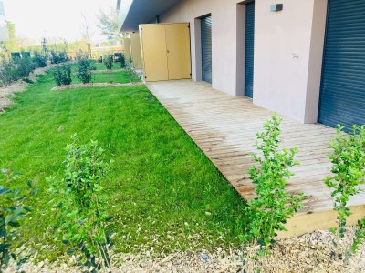 Un promoteur nous a sollicités pour poser des terrasses en bois au rez-de-jardin des appartements finis récemment. Les lames de 140 mm de largeur sont en pin traité, adapté pour l’extérieur. Elles sont posées, avec côté lisse en apparent et perpendiculairement, sur la façade principale. Ceci, afin de donner une impression de longueur au salon.