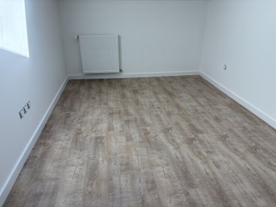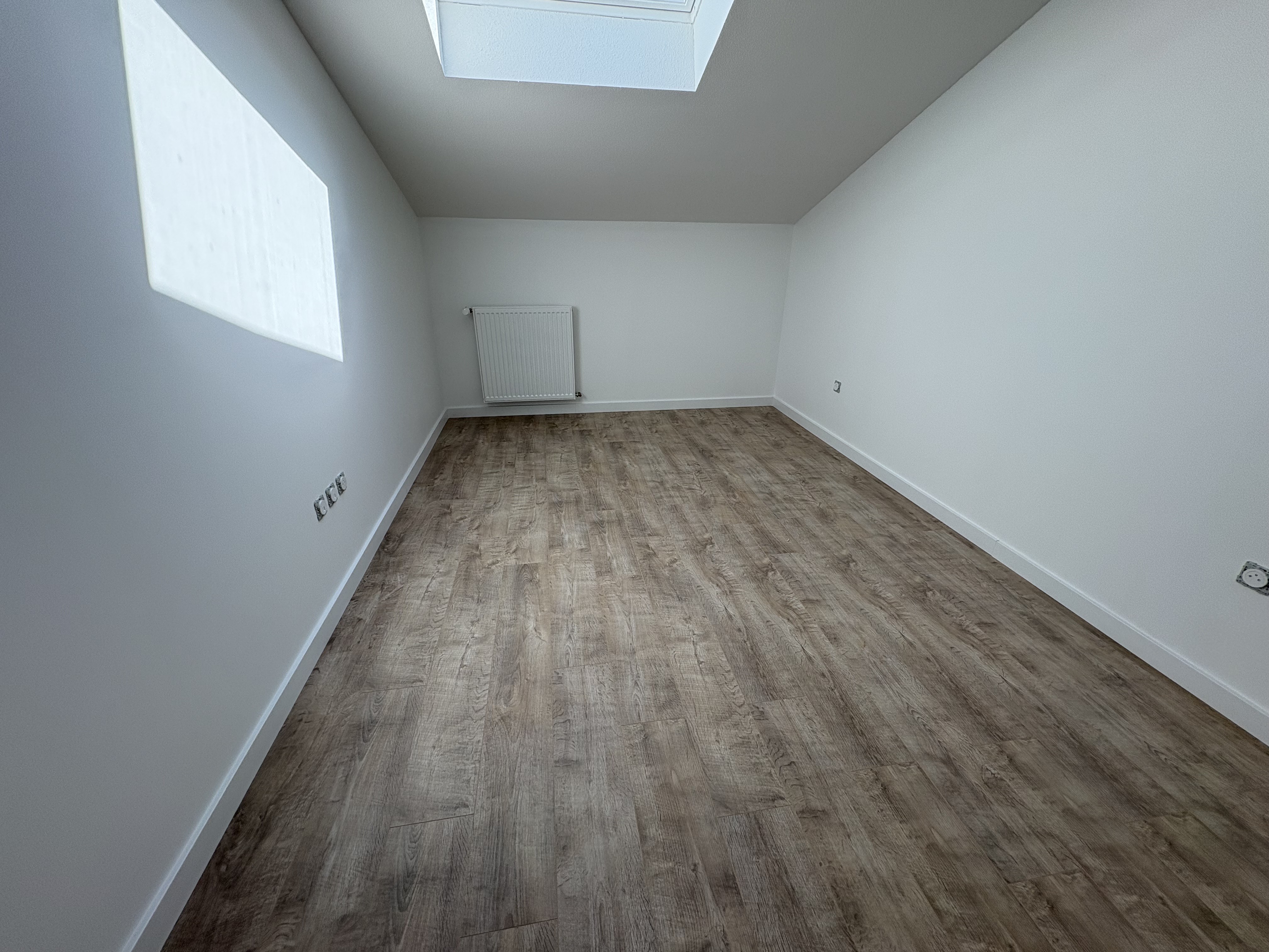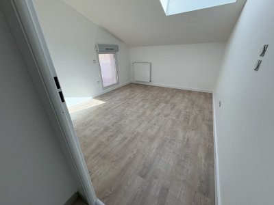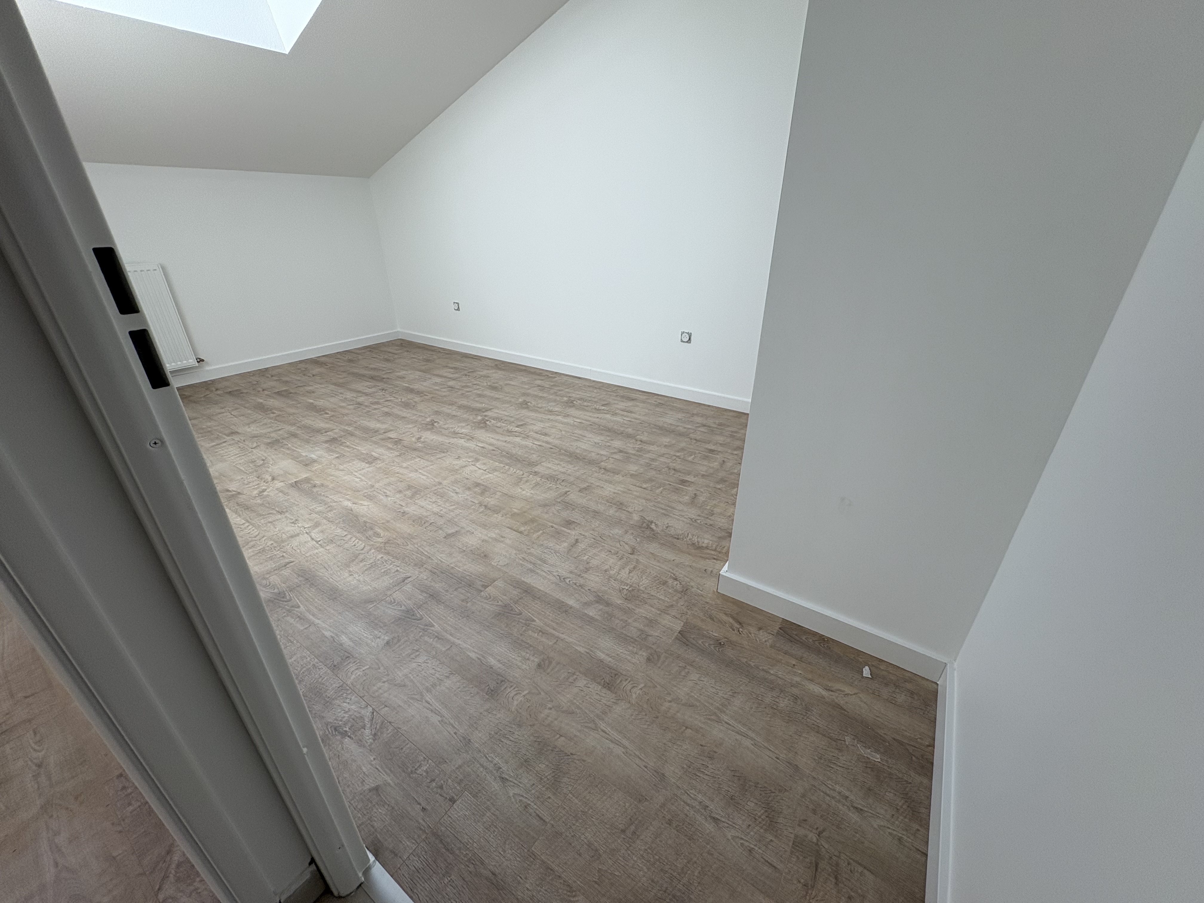 Les grandes fenêtres de toit laissent entrer la lumière naturelle, qui se reflète subtilement sur le sol effet bois, renforçant la clarté de l’espace. C’est un vrai coup de neuf pour ces deux pièces désormais prêtes à être aménagées.